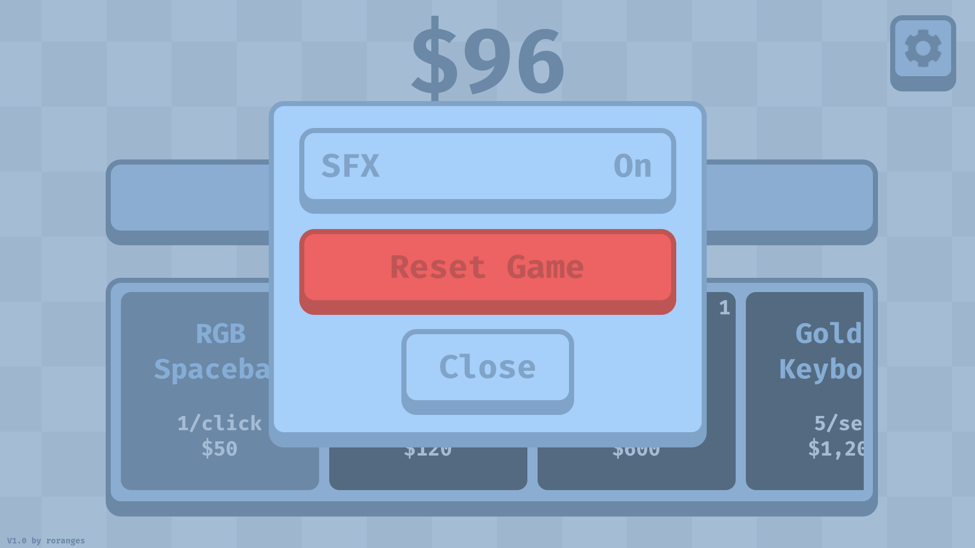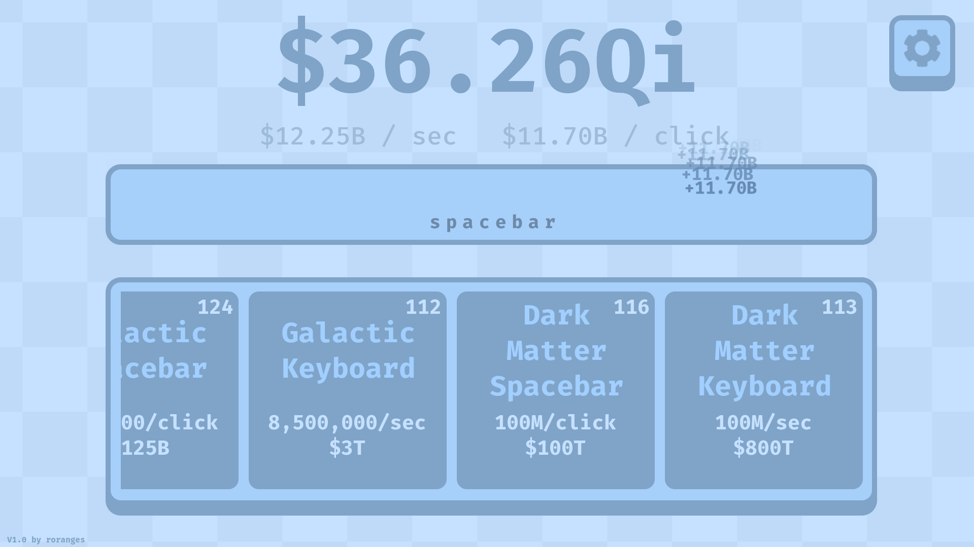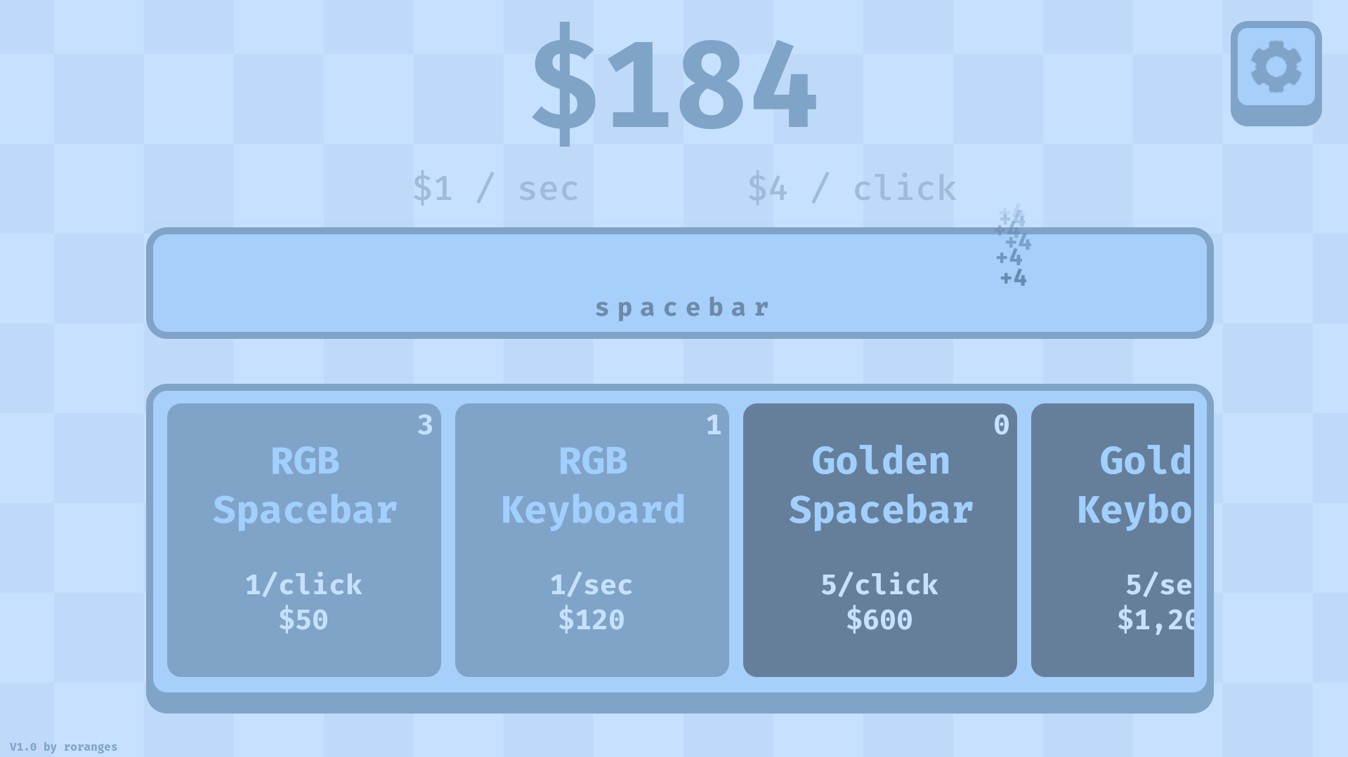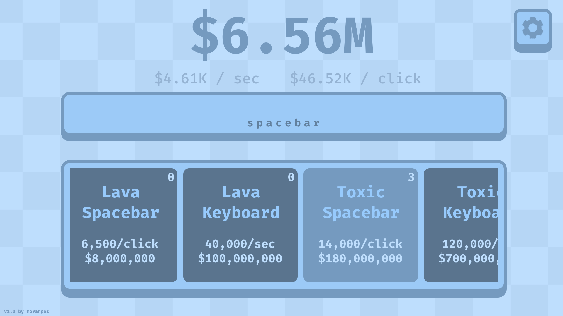 Have you ever wanted to click a spacebar for hours on end? Well Spacebar Clicker is the game for you! In this game all you do is click a spacebar. Simple. There are 22 different upgrades to grind your way to buy. Have fun clicking your space bar and getting those upgrades!